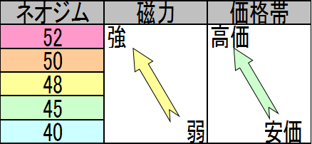 数字が大きいほど磁力が上がる傾向にあります。