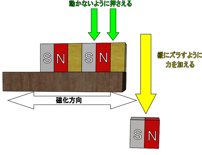 基本的な取り外し方法としては、磁化方向(着磁方向)に対して垂直方向に力を加えると、磁石を外しやすくなります。